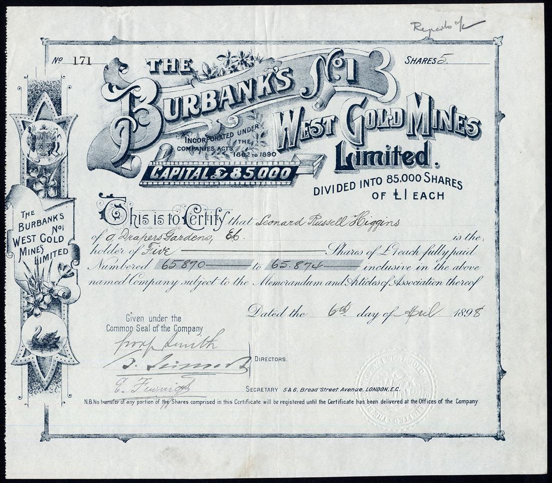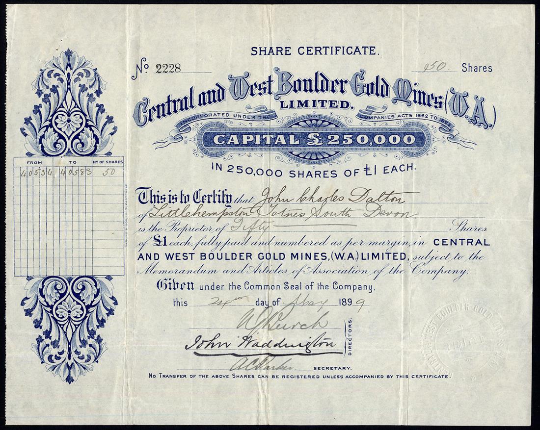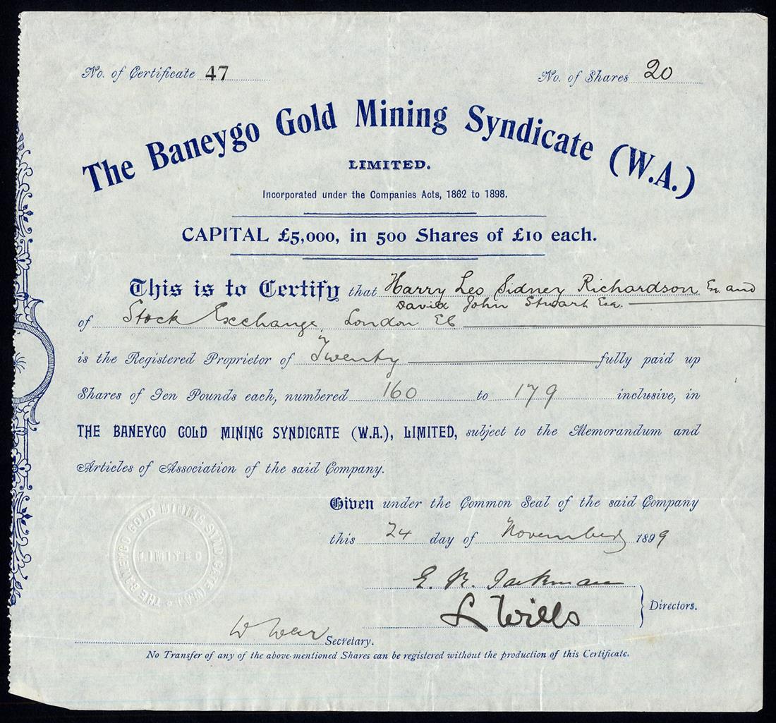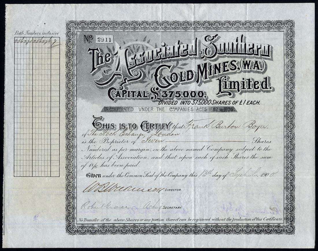 Western Australia: A selection of Gold Mines, comprising Associated Southern Gold Mines (W.A.) Ltd., £1 shares, 18/6d paid, 190[0], no.2911; Baneygo Gold Mining Syndicate (W.A.) Ltd., £10 shares, fully paid, 189[9], no.47; Burbank's No.1 West Gold Mines Ltd., £1 shares, fully paid, 189[8], no.171; Central & West Boulder Gold Mines (W.A.) Ltd., £1 shares, fully paid, 189[9], no.2228; Croesus North No.1 Ltd., £1 shares, fully paid, 189[8], no.338; Eagles Nest (Mount Margaret) Gold Mining Co. Ltd., £1 shares, fully paid, 189[6], no.258; Norseman Gold Mines Ltd., £1 shares, fully paid, 189[8], no.0614; South Fingall Ltd., 4/- shares, fully paid, 190[2], no.2040; Westralian Gold Leases Agency Ltd., £1 shares, 18[97], no.9, and, White Feather Main Reef Gold Mining Co. Ltd., £1 shares, part paid, 18[95], no.81, mixed condition but generally very fine or thereabouts, (10)