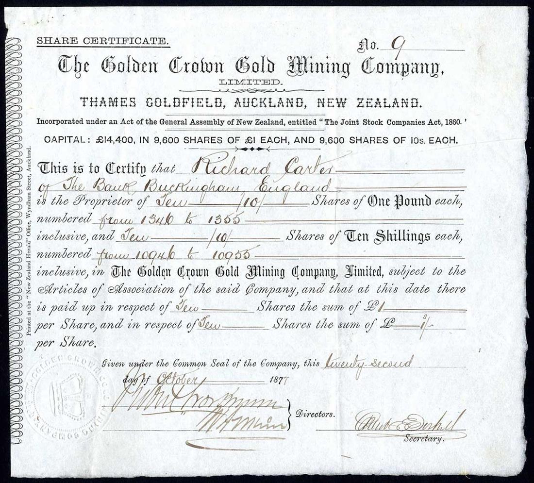 Golden Crown Gold Mining Co. Ltd., Thames Goldfield, £1 and 10s shares, 187[7], black, printed in Auckland, good very fine and rare.