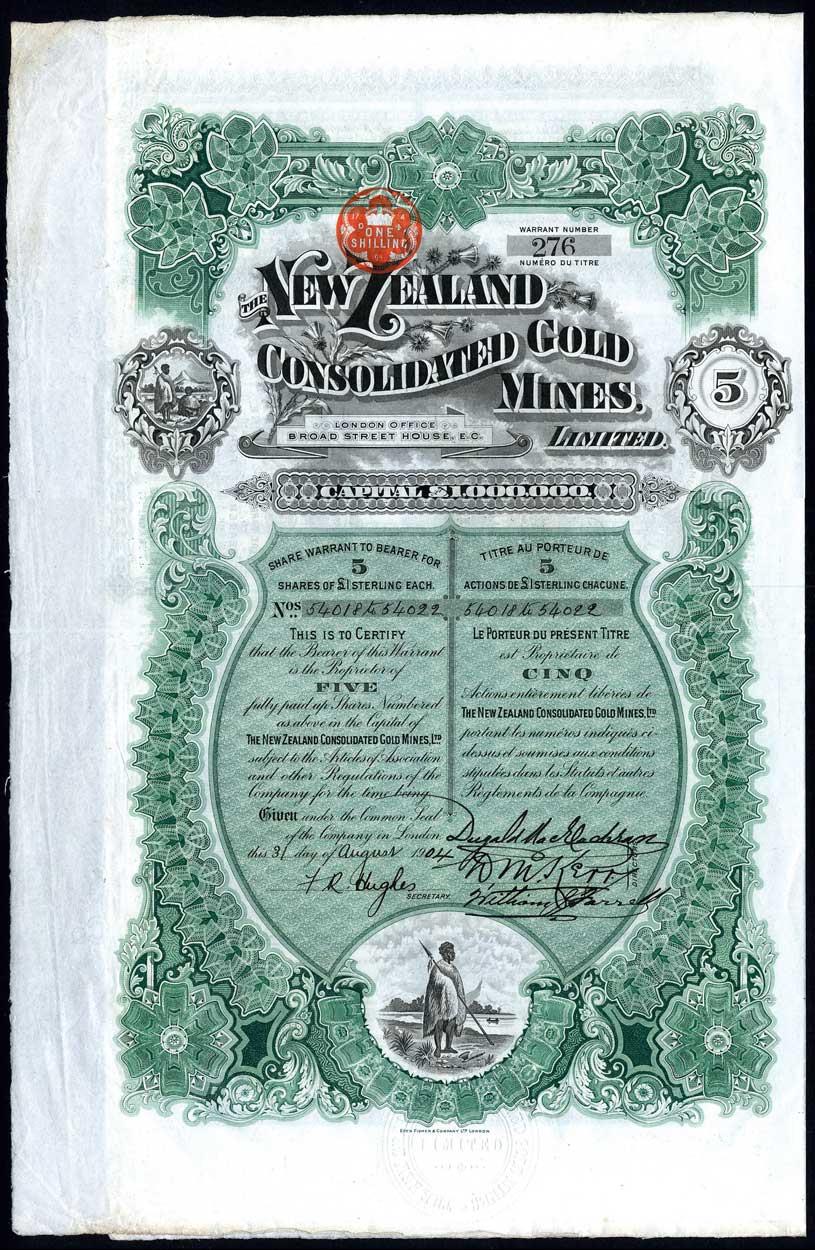 New Zealand Consolidated Gold Mines Ltd., bearer warrant for 5 shares of £1, London 19[04], no.276, very attractive piece with vignettes of Maori warriors, green and black, printed by Eden Fisher & Co., with coupons, good very fine.
