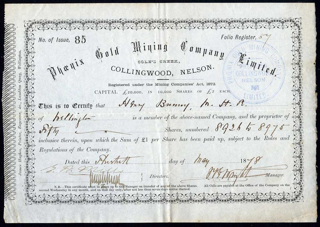 Phoenix Gold Mining Co. Ltd., Cole's Creek, Collingwood, Nelson, £2 shares, 18[78], no.85, ornate border, black, printed in Wellington, very fine and rare.