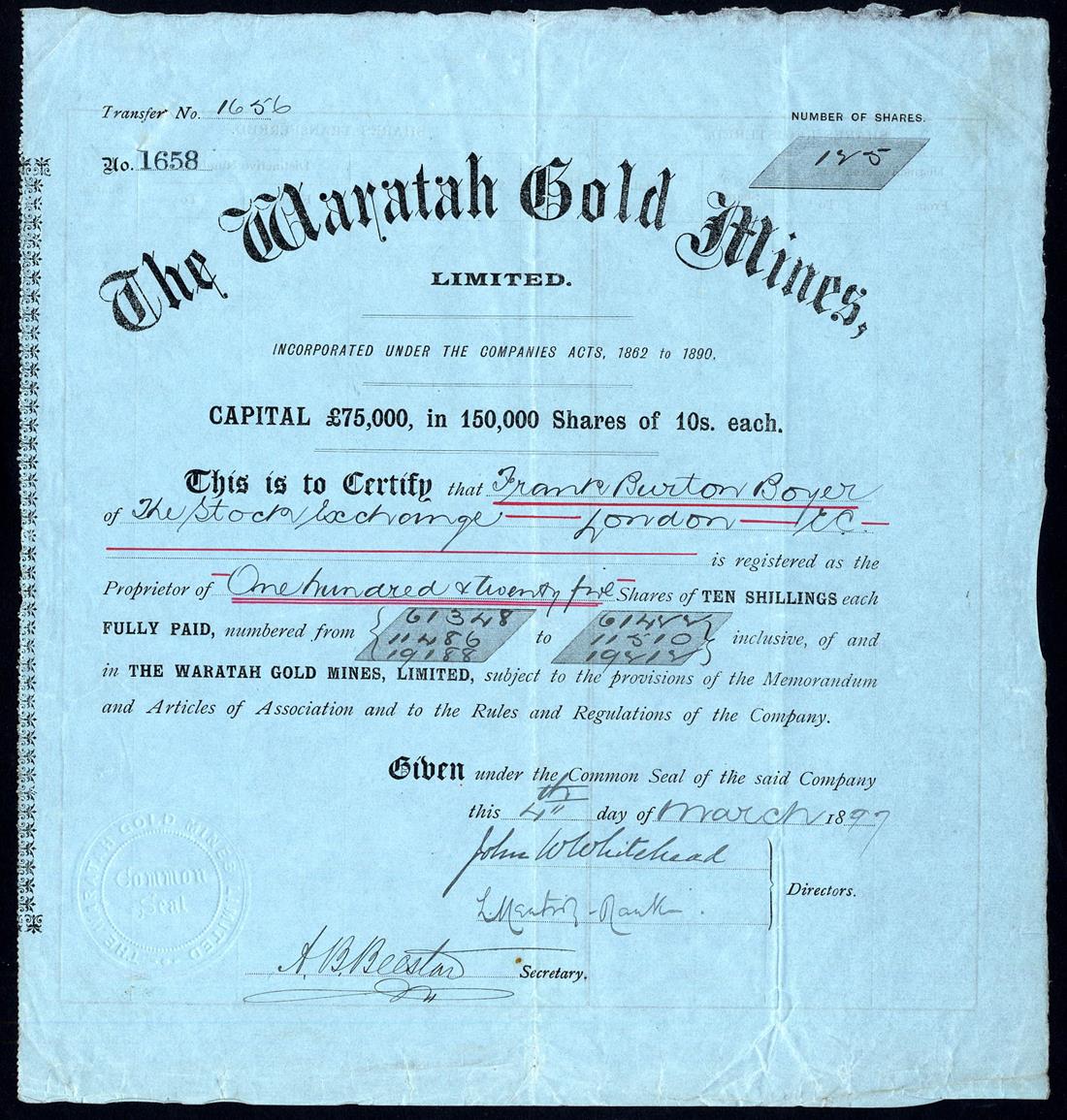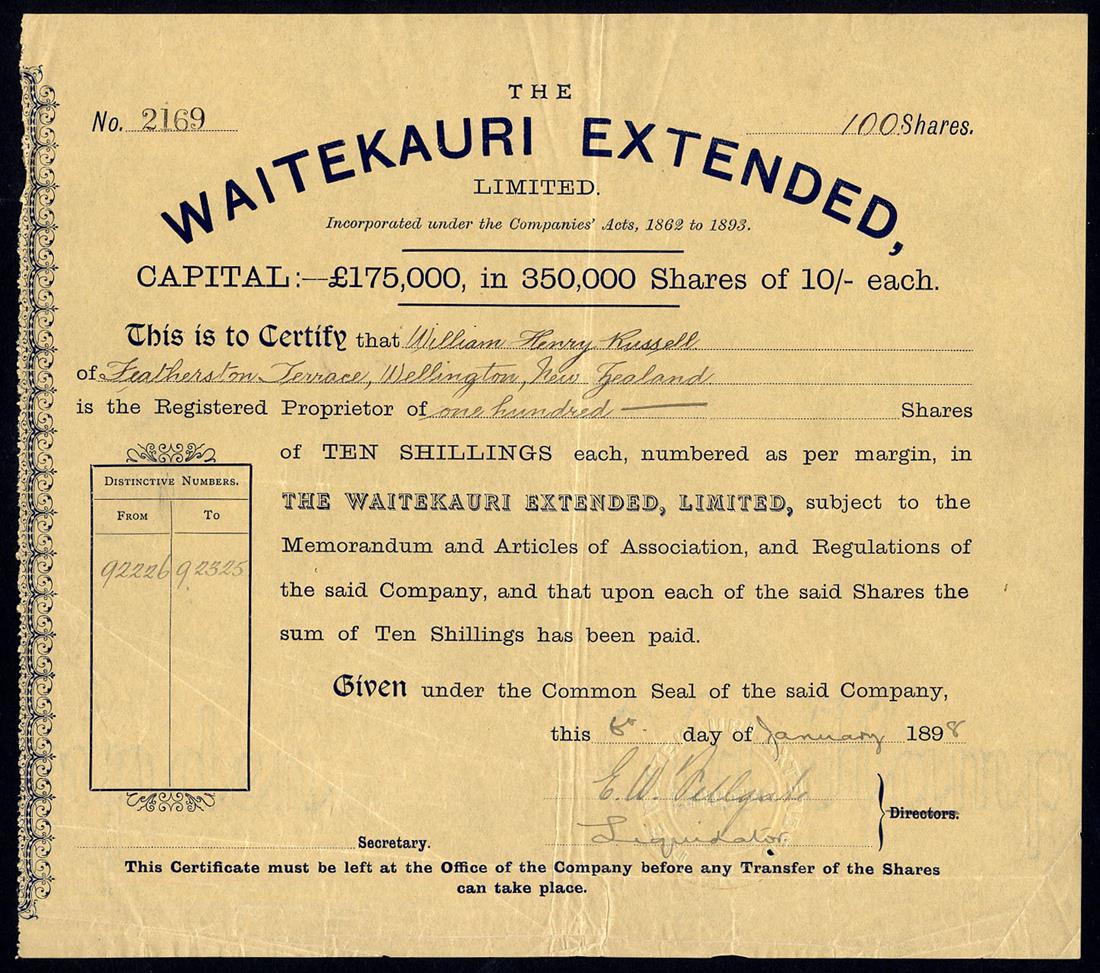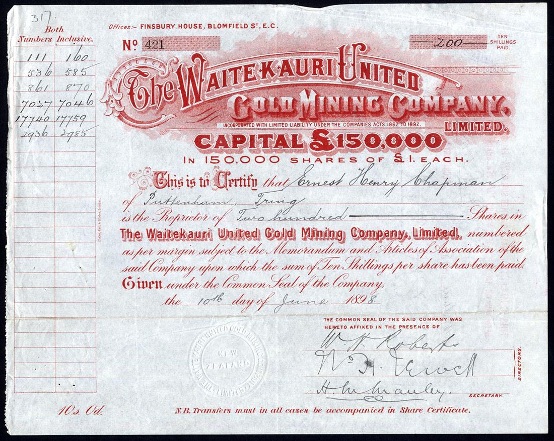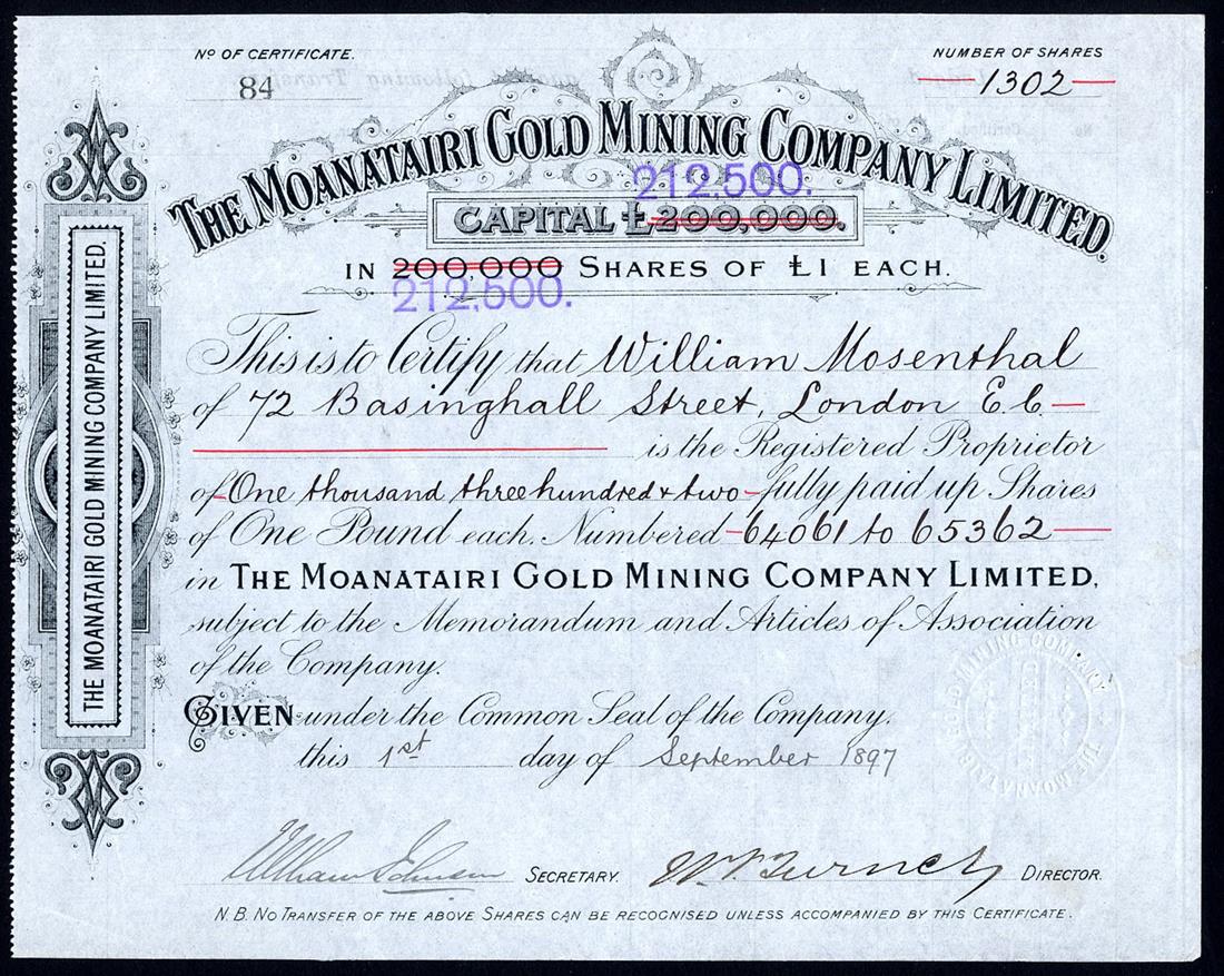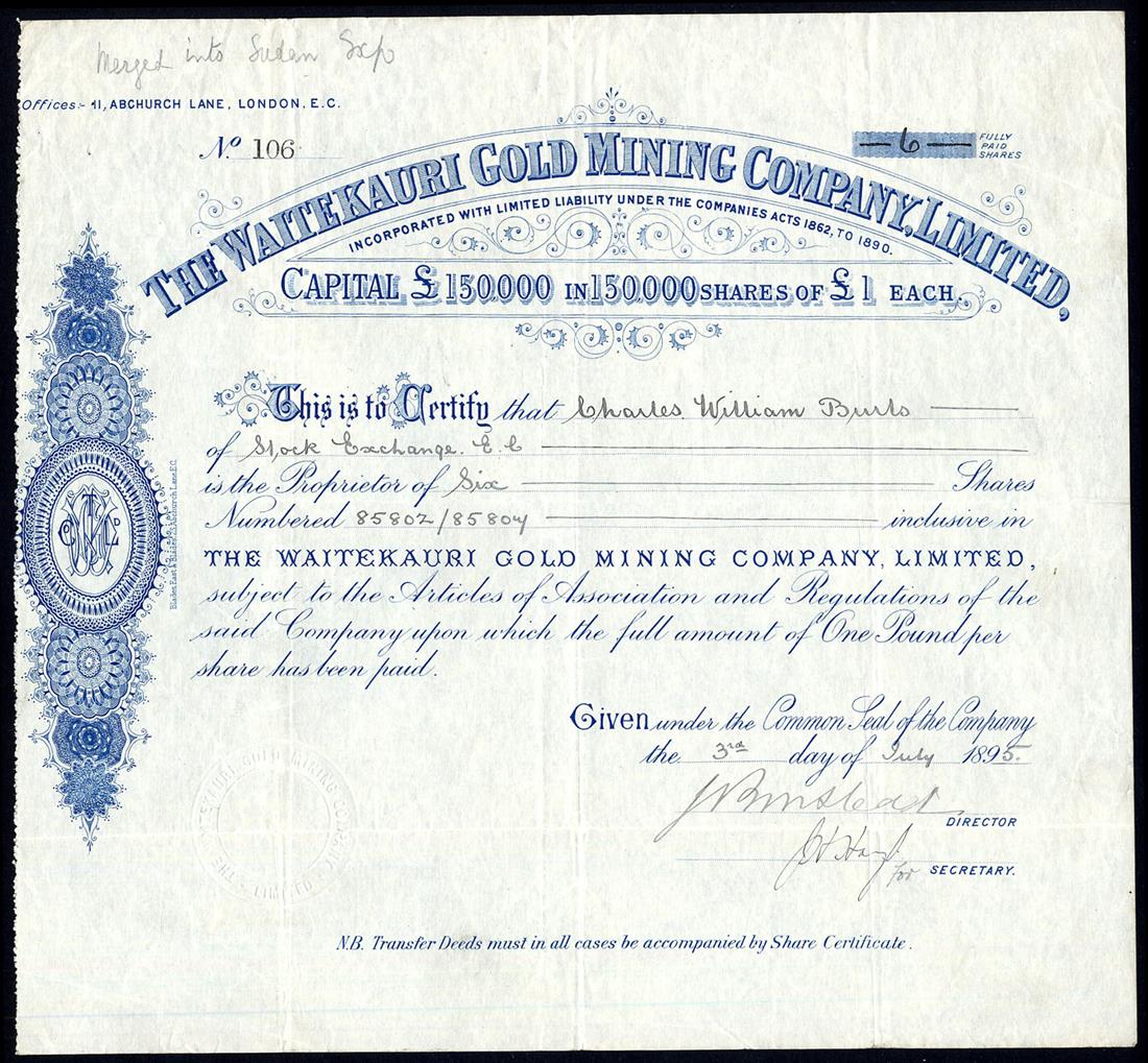 A small selection of Gold Mining companies comprising Moanatairi Gold Mining Co. Ltd., £1 shares, [1897], no.84, black, capital overprinted with increase; Waitekauri Extended Ltd., 10s shares, 189[8], no.2169, blue on orange brown paper, signed by the liquidator; Waitekauri Gold Mining Co. Ltd., £1 shares, 189[5], no.106, blue; Waitekauri United Gold Mining Co. Ltd., £1 shares, 189[8], red, and Waratah Gold Mines Ltd., 10s shares, 18[97], no.1658, black on blue paper, generally very fine or thereabouts. (5)