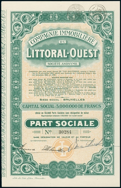 Compagnie Immobilière du Littoral-Ouest. Part Social, Bruxelles 9.3.1929, #30284. EF.