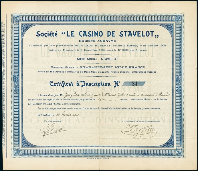 Le Casino de Stavelot. Certificat d'Inscription pour 2 Action F250, Stavelot, 1.2.1910, #24. VF.