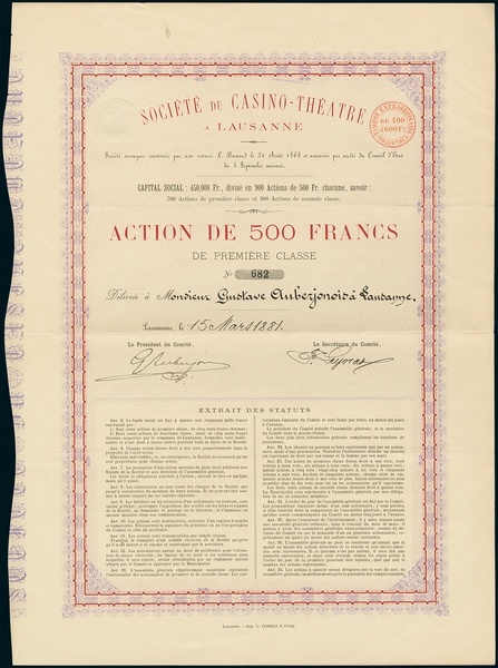 Casino-Théatre a Lausanne. Action Fr. 500 1. Classe, Lausanne 15.3.1881, #682. EF.