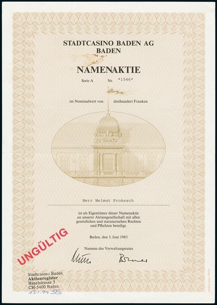 Stadtcasino Baden. Namenaktie Serie A Fr. 300, 3.6.1985, #1546. Invalidated 1999. Stains. EF.
