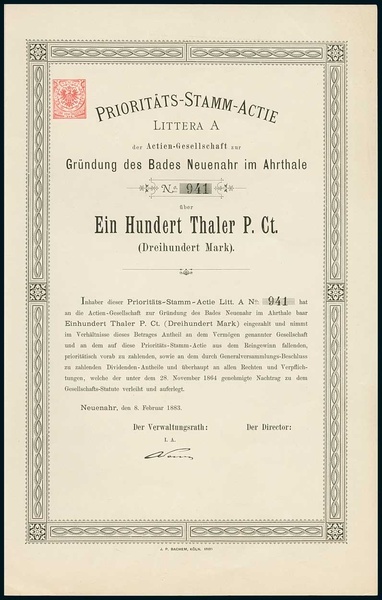 Actiengesellschaft zur Gründung des Bades Neuenahr im Ahrthale. Prioritäts-Stamm-Actie Lattera A 100 Thaler P.Ct / 300 Mark, Neuenahr 8.2.1883, Unissued. UNC.