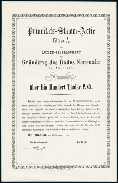 Actiengesellschaft zur Gründung des Bades Neuenahr im Ahrthale. Prioritäts-Stamm-Actie Littera A 100 Thaler P.Ct., Neuenahr 15.12.1864, Unissued, UNC.