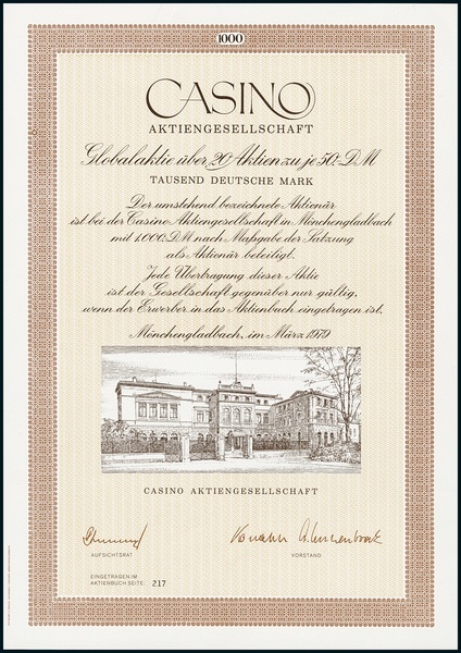 Casino Aktiengesellschaft in Möchengladbach. Aktie DM 1000, Mönchengladbach 3.1979, #217 Aktienbuchseite 217. UNC.