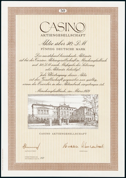 Casino Aktiengesellschaft in Möchengladbach. Aktie DM 50, Mönchengladbach 3.1979, #Aktienbuchseite 217. UNC.