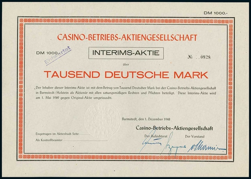 Casino Betriebs-Aktiengesellschaft in Barmstedt / Holstein. Interims-Aktie DM 1000, Barmstedt 1.12.1948, #0828. EF.