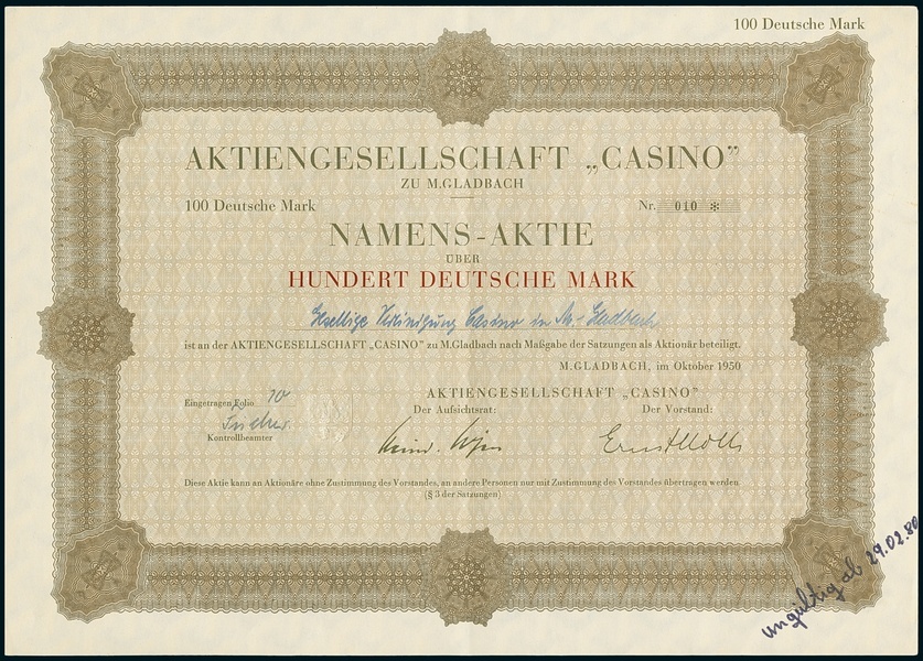 Casino zu M.Gladbach. Namens-Aktie DM 100, M.Gladbach 10.1956, #010. EF.