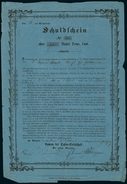 Casino-Gesellschaft zu St.Wendel. Schuldschein 10 Thaler Preus. Cour., St. Wendel, 4.1859 blau, #245. VF.