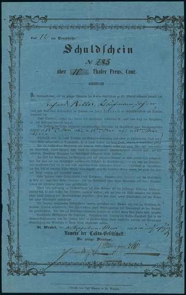 Casino-Gesellschaft zu St.Wendel. Schuldschein 10 Thaler Preus. Cour., St. Wendel, 7.1861 blau, #285. VF.