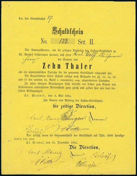 Casino-Gesellschaft zu St.Wendel. Schuldschein 10 Thaler, Ser. II, St. Wendel, 2.5.1864 gelb, #123. VF.