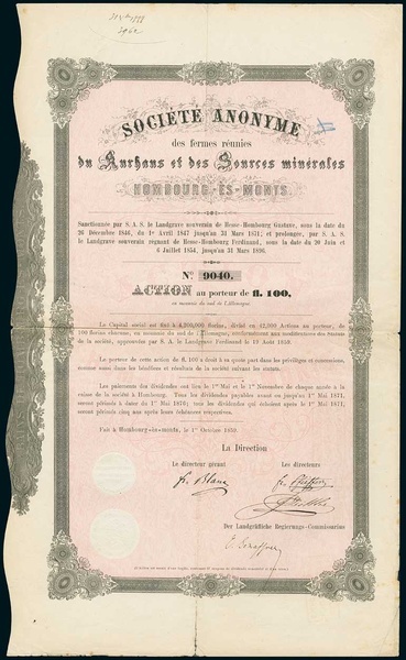 Fermes réunies du Kurshaus et des Sources Minérales Hombourg-ès-Monts. Action 100 Gulden, Hombourg-ès-monts 1.10.1859. #9040. WithSignature of Francois Blanc (1806-1877), signs of wear and fold repaired. F.