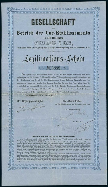 Gesellschaft zum Betrieb der Cur-Etablissements in den Badeorten Wiesbaden & Ems. Legitimations-Schein zu einer ausgelosten Actie zu 100 Gulden. Wiesbaden 1.10.1865. #6888. Folds repaired. VF