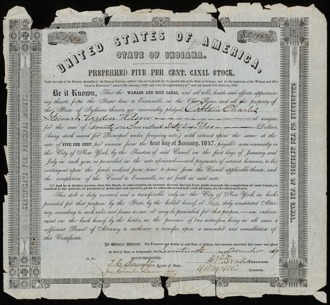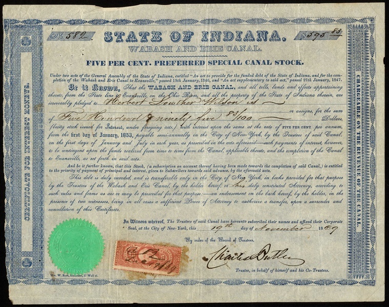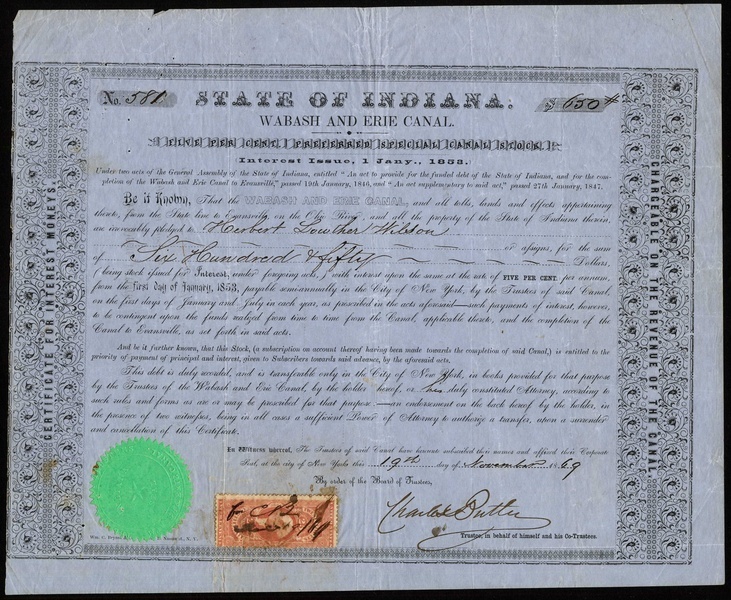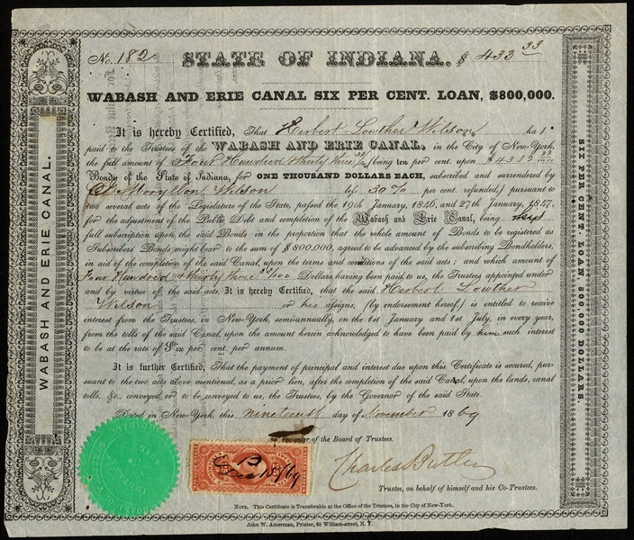 State of Indiana, Wabash and Erie Canal, a group of four certificates comprising; 6% Loan $800,000, bond for $1000, 18[69], no.182; preferred 5% canal stock, 18[69], no.1954, black (this one with many edge tears); 5% preferred special canal stock, 18[69], no.582, blue, and, 5% preferred special canal stock, 18[69], no.581, black on blue paper, the second rather poor otherwise AVF (4).
