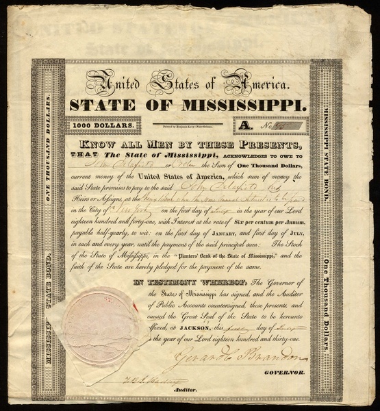 State of Mississippi, 6% 'Planters' Bank' Loan, 1831, bond for $1000, series A, redeemable 1841, no.95, signed by the Governor, Gerard Brandon, attractive engine turned borders, black, with coupons, also with coupon sheet for obtaining interest payments in London, fine to very fine.