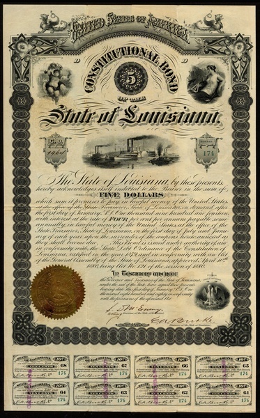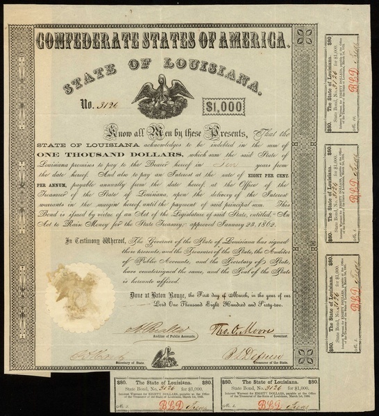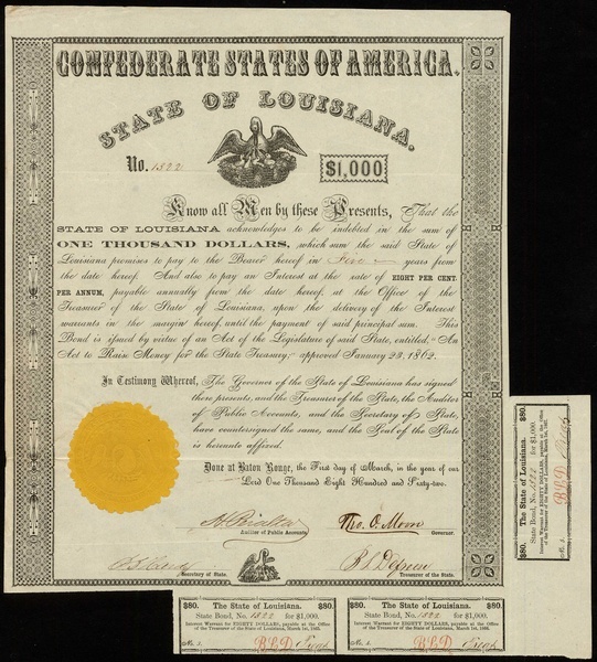 Confederate States of America, State of Louisiana, three 8% bonds for $1000 each, all 1862, nos.1322, 1335 payable in 5 years and 3126, payable in 10 years, ornate border and state seal at top, black, all with coupons, together with, State of Louisiana Constitutional Bond for $5, 1880, no.174, decorative piece with allegorical figures, shipping scene and state seal, black, with coupons, GVF, the last AVF (4).