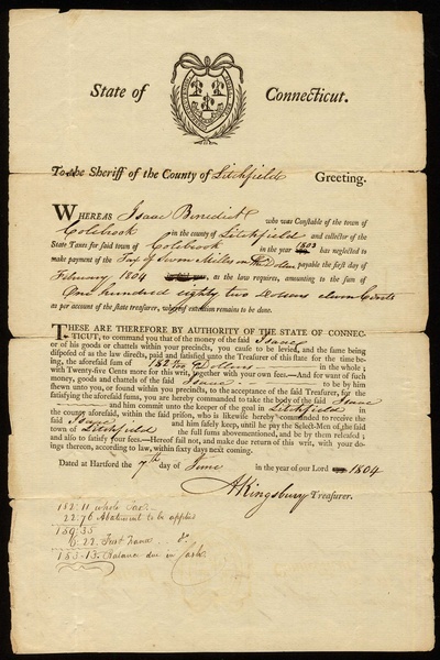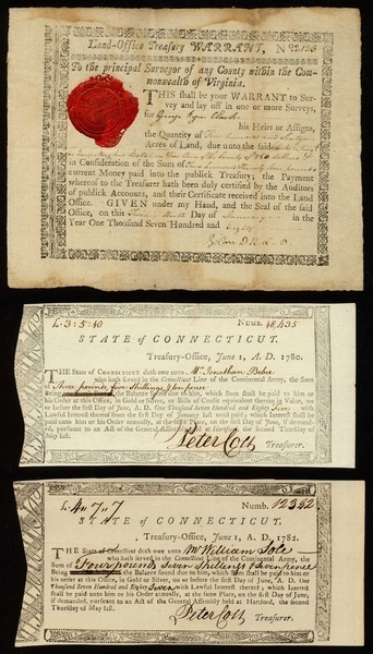 State of Virginia, Land Office Treasury Warrant, 17[80], no.2123, black printing, red wax seal, together with State of Connecticut, treasury notes for service in the Continental Army (3), 1780 and 1782, and document regarding unpaid taxes addressed to the Sheriff of the county of Litchfield, [1804], the first stained, AVF, the last GF, the remainder EF. (5)