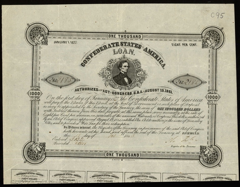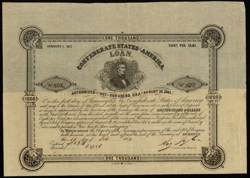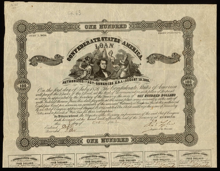 Confederate States of America: Act of 19 August 1861, 8% Loans comprising $100 and $1000, redeemable July 1876, $1000, redeemable January 1877, 1 genuine and 4 counterfeit, $100, $500 and $1000, 2 examples, 1counterfeit, redeemable January 1878 (Ball 96, 101, 106, X106(4), 112, 113, 115, X115), mixed condition, a few toned and brittle, fine to very fine. (11)