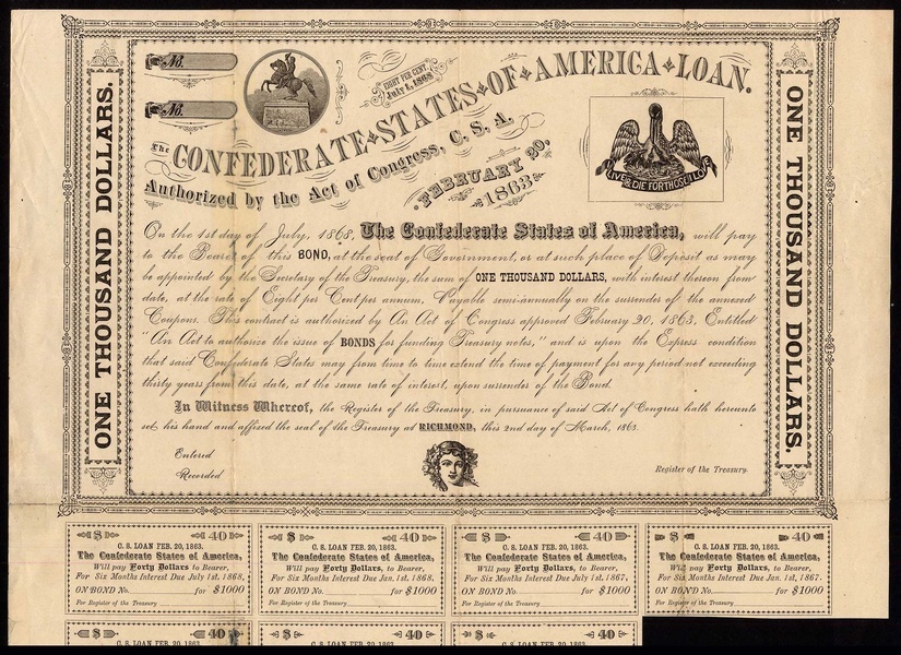 Confederate States of America: Act of 20 February 1863, 8% Loan, a contemporary fantasy bond for $1000, statue of Jackson on horseback at top left, pelican at right, black, with coupons (Ball page 237), split and repaired at fold at left, fine to very fine, scarce and interesting.