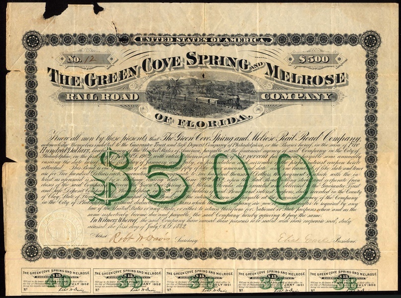 Green Cove Spring and Melrose Rail Road Co. of Florida, 6% bond for $500, 1882, no.12, of only 100 issued, steam train amidst palm trees at top, black, green underprint, with coupons some damage to top left and some separation at folds, fine and very rare.