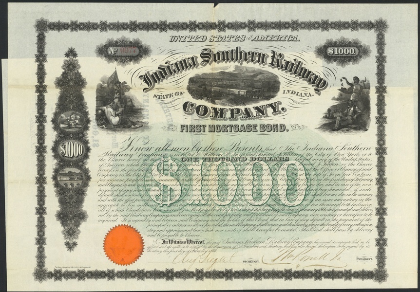 Indiana Southern Railway Co. (IN), First Mortgage bond for $1000, 1866, no.9022, signed on the reverse by Samuel Tilden as Trustee, large format piece with steam train and bridge in distance, allegorical figures either side, black, blue underprint, orange paper seal, good very fine.