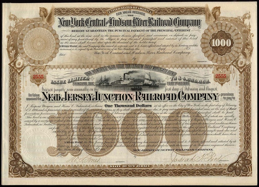 New Jersey Junction Railroad Co., 100 year 4% first mortgage bond for $1000, 1886, no.2555, signed on reverse by J. P. Morgan as trustee, vignette of steamboats on river in centre, ornate border, printed by the American Bank Note Co., brown and black, with coupons, EF.