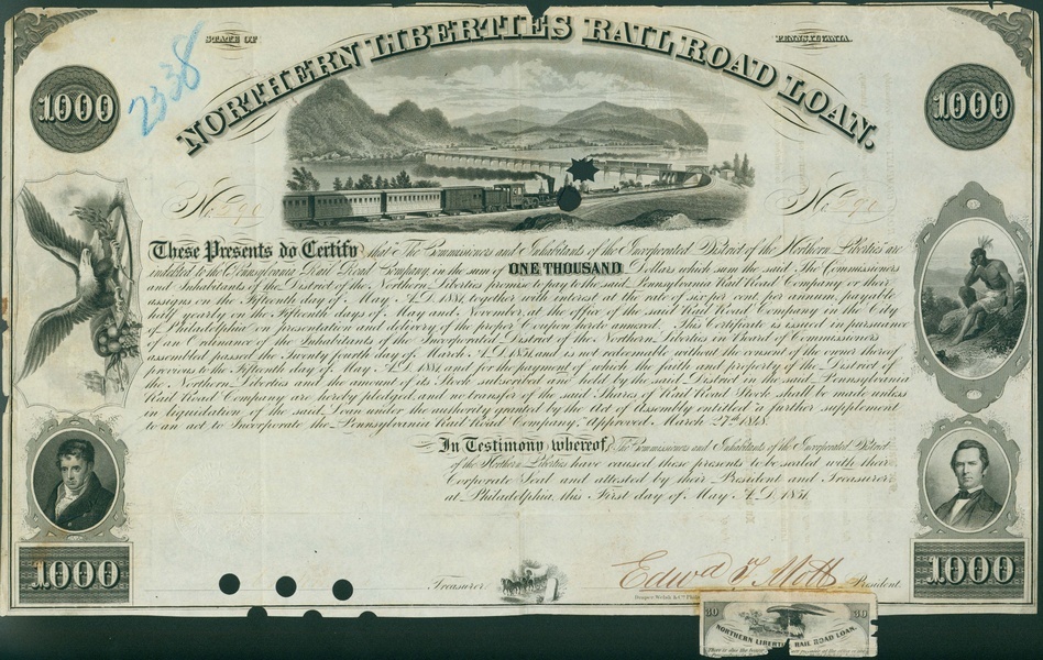 Northern Liberties Rail Road, 6% Bond (subscribed by the Pennsylvania Railroad) for $1,000, Philadelphia, 1851, no. 290, black, white, six decorative vignettes, hole cancellation, one coupon attached. The company was incorporated as Northern Liberties and Penn Townships Railroad in 1829. It later became part of the Pennsylvania Railroad. Trimmed (as usual), small paper losses at upper margin, but in comparison with other known certificates in good condition, about very fine.