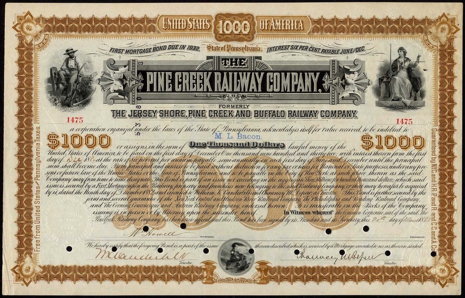 Pine Creek Railway Co. (PA), 6% first mortgage bond for $1000, 18[85], no.1475, signed by William H. Vanderbilt and Chauncey Depew as trustees, allegorical figures at top and steam engine at bottom, ornate border, brown and black, printed by the American Bank Note Co., hole punched through signature strips, EF.