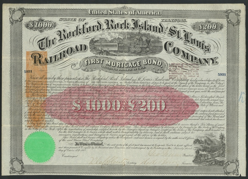 Rockford, Rock Island and St.Louis Railroad Co., Illinois, 7% First Mortgage Bond, $1000 or £200, convertible and payable in gold, 1868, no.5931, steam train passing through countryside, green seal, black, red underprint, imprinted revenue stamps W2 and P5 x 2, no coupons remain, endorsed with 50% cancelled in 1872, very fine.