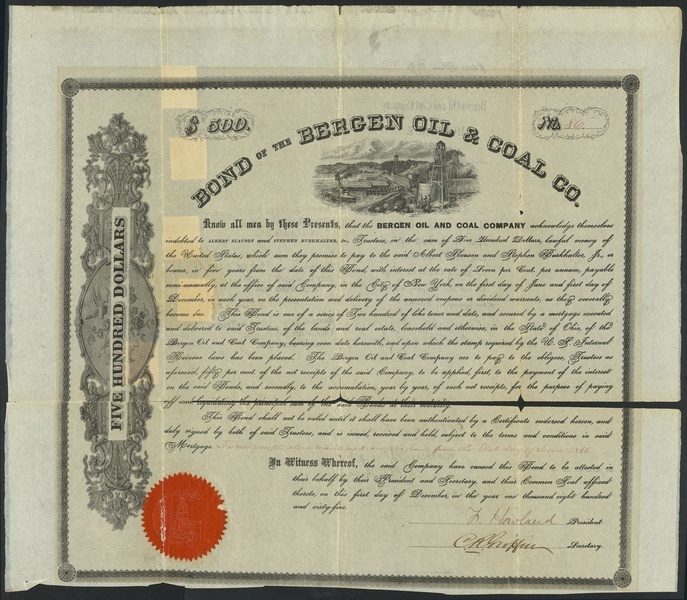Bergen Oil & Coal Co., Ohio, 7% bond for $500, 1865, no.86, large format piece with vignette of oil wells and barrels being loaded onto river steamers, black, red seal, no coupons remain, separated along folds, good fine.
