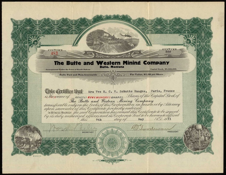 (x) The Butte and Western Mining Company, (Lot of 10 items), share certificates, South Dakota, 1921, with three vignettes showing the mine and the mining process, including a booklet about Butte's history, VF-EF (10)