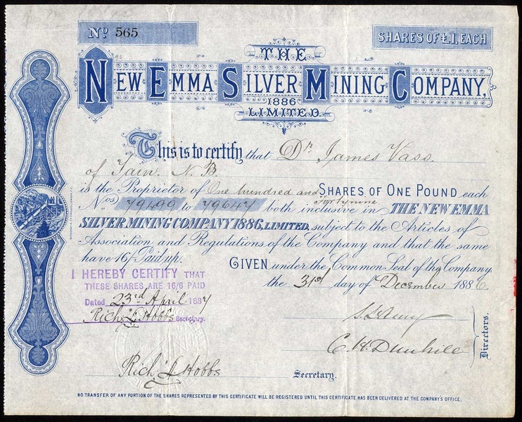New Emma Silver Mining Company 1886 Ltd., £1 shares, 188[6], no.565, small vignette of sluice at left, blue, VF and rare.