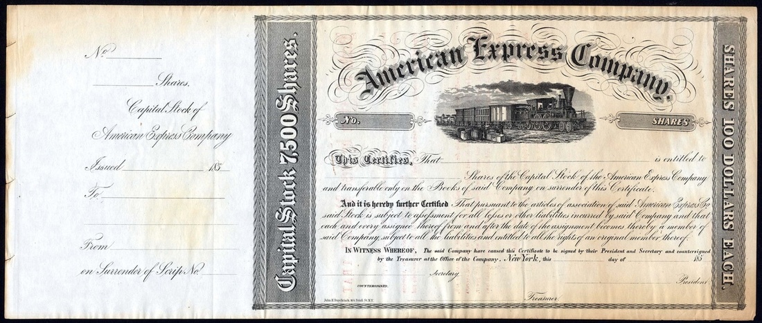American Express Company, an unissued certificate for $100 shares, 185-, capital 7500 shares, steam train in centre, black, with counterfoil, some discolouration as usual, good very fine.