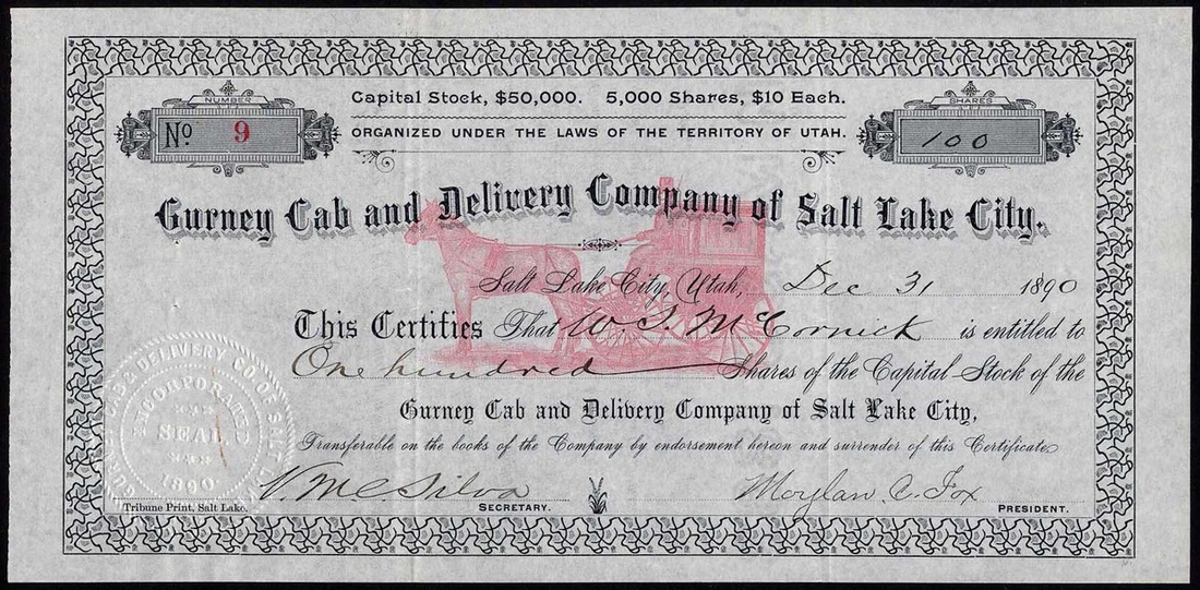 Gurney Cab and Delivery Company of Salt Lake City, $10 shares, 189[0], no.9, signed by Moylan C. Fox as President, red underprint vignette of horse and cab (gurney), black print, GVF and scarce.