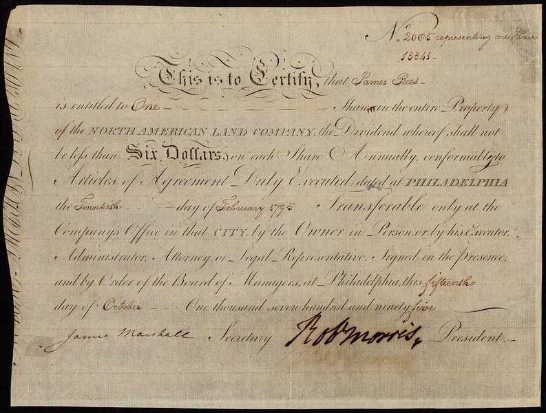 North American Land Company, certificate for [1] share, 179[5], no.2085, signed by Robert Morris as President, scrollwork at left, black, good signature with no ink burning, minor repairs on the reverse and trimmed at edges, VF