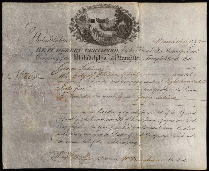 Philadelphia & Lancaster Turnpike Road, certificate for one share, 179[5], no.865, signed by William Bingham as President, vignette of wagon and horses approaching toll gates, black, on vellum, a ittle translucent, GVF.
