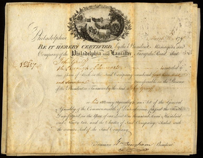 Philadelphia & Lancaster Turnpike Road, a group of certificates, each for one share, 179[5], signed by William Bingham as President (4) and 179[6], signed by Israel Whelen as President (4), vignette of wagon and horses approaching toll gates, black, on vellum, all with some toning, two of the first group with professional repair where worn away at folds, generally VF (8)