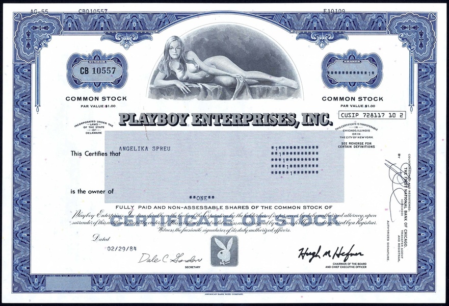 Playboy Enterprises Inc. (DE), common stock certificate, [1984], no.CB10557, facsimile signature of Hugh Hefner as President, nude girl reclining, her long hair and arm placed to ensure the necessary modesty, bunny logo at bottom, blue and black, extremely fine.