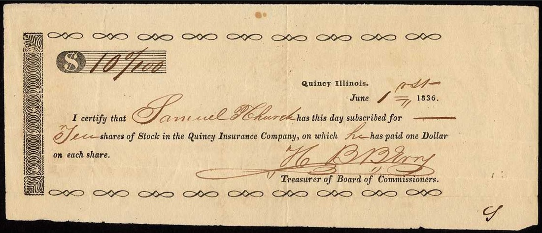 Quincy Insurance Co., certificate for $1 shares, Illinois 1836, small piece, decorative border, black printing, AVF