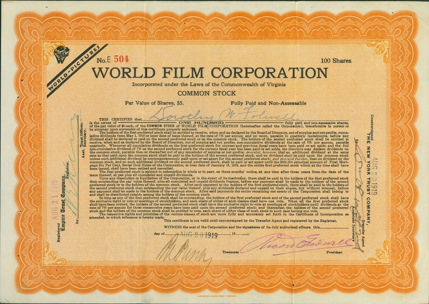 World Film Corporation, share certificate for 100 common shares, [1919], orange, embossed seal. Formed in 1915, the company included the theatrical interests of the Shubert family (responsible for the establishment of the Broadway district in New York City as hub of the theatre industry in the United States) and William Aloysius Brady (American theatre actor, producer and sports promoter). The first major move was the acquisition of Clara Kimball Young, an American film actress being highly regarded and publicly popular in the early silent film era. Folds, pinholes, very fine.