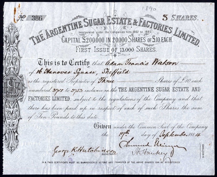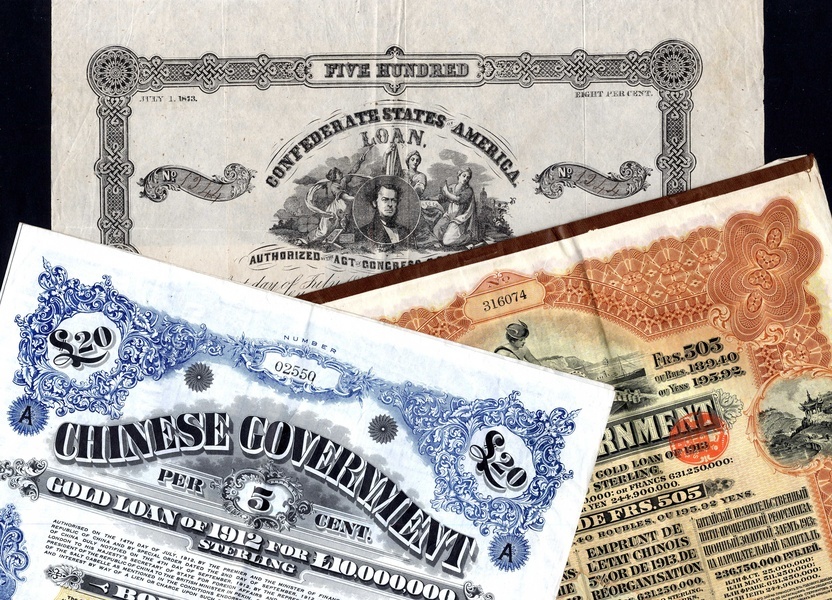A miscellaneous accumulation of certificates, includes Argentine Sugar Estate & factories Ltd., 188[4]; Chinese Government, 5% Gold Loan, 1912, £20 bond; Chinese Government, 1913 5% Reorganisation Gold Loan, £20, French issue; Brazil 5% Loan, 1908, 500 francs, large format and two Confederate bonds for $500, 1862, some very fine. (28 plus related paperwork)