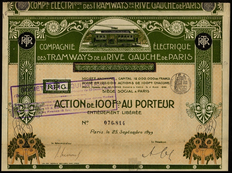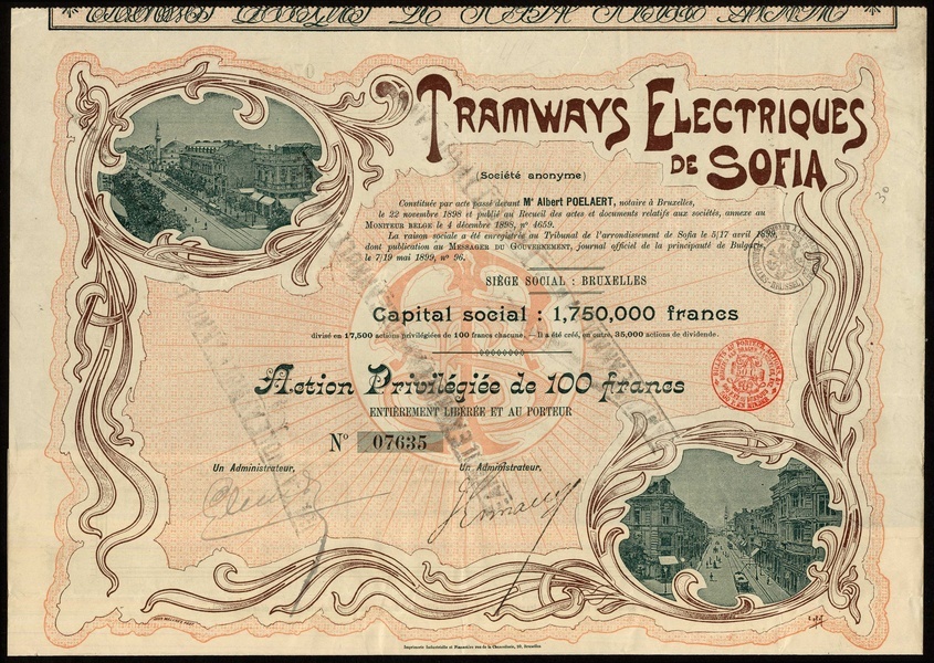 A group of Belgian and French Tramway companies, comprising; Tramways Electriques de Sofia, 1898; Compagnie Electrique des Tramways de la Rive Gauche de Paris, 1899; Biarritz-St. Sebastien-Tolosa S.A. de Tramways Electriques, 1910; Tramways de Lille S.A., 1900; S.A. des Tramways a Vapeur Interprovinciaux de Milan Bergame Cremone, 1883; S.A. Tramways Unis de Bucarest, 1899; S.A. Belge de Tramways, 1896; Compagnie Generale des Tramways d'Athenes et du Piree, 1899 (2), a colourful lot, mostAVF, some minor damage. (9)