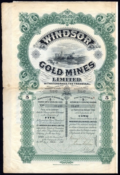 Windsor Gold Mines Ltd. (Transvaal), bearer warrant for 5 shares of £1, 19[02], no.B/5 2197, lovely vignette of Windsor Castle, green and black, printed by Waterlow & Sons, with coupons, small split at centre fold, very fine and scarce.