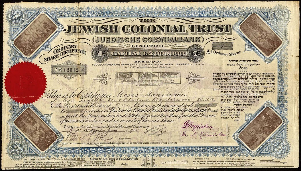 Jewish Colonial Trust (Juedische Colonialbank) Ltd., nominative certificate for ordinary shares of £1 each, 1[900], no.12012, ornate border and corner vignettes depicting agriculture and industry, blue and black, map in underprint, with coupons, split along fold but otherwise about very fine.