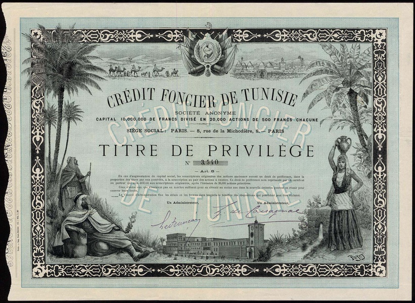 Credit Foncier de Tunisie, 'titre de privelage', circa 1890, a group of 10 certificates, very beautiful piece with large building bottom centre, Arab smoking a long pipe at left, girl carrying water jug at right, signed by the artist Louis Poyet, black, blue underprint, extremely fine. (10)