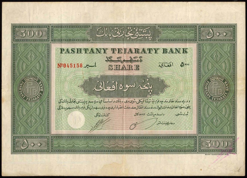 Afghanistan: Pashtany Tejaraty Bank, 500 Afghani share, circa 1955, No.145158, ornate border and underprint, green, printed by Giesecke & Devrient, Berlin, VF and scarce.