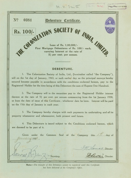 Colonization Society of India, Limited, 5.5% First Mortgage Debenture for 100 Rupees, 193[8], no.381, of only 1000 issued, black, blue-grey, embossed seal. The company was formed in 1933. and acquired 10,000 acres of land spread across the villages of Harhu, Duli, Ramdagga, Konka, Lapra, Hesalong, Mayapur, Mohulia and Baseria. Sold shares to Anglo-Indians who wished to settle in the new colony with eventually around 350 families settling in the area. Extremely fine.